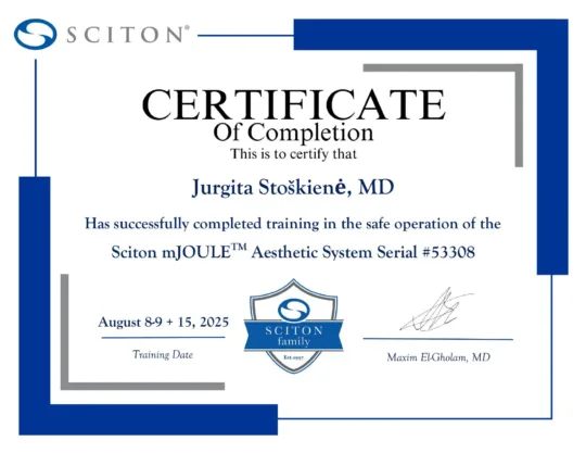 Nuo 2022 m., Merz Aesthetics – Ultherapy trenerė Pabaltijos regione. “Ulthera” (SMAS liftingas), visi mūsų klinikų gydytojai yra individualiai apmokinti dirbti su šiuo aukso standarto HIFU, pagal visus reikiamus protokolus, būtent tai ir nulemia šios procedūros efektingumą ir saugumą.
