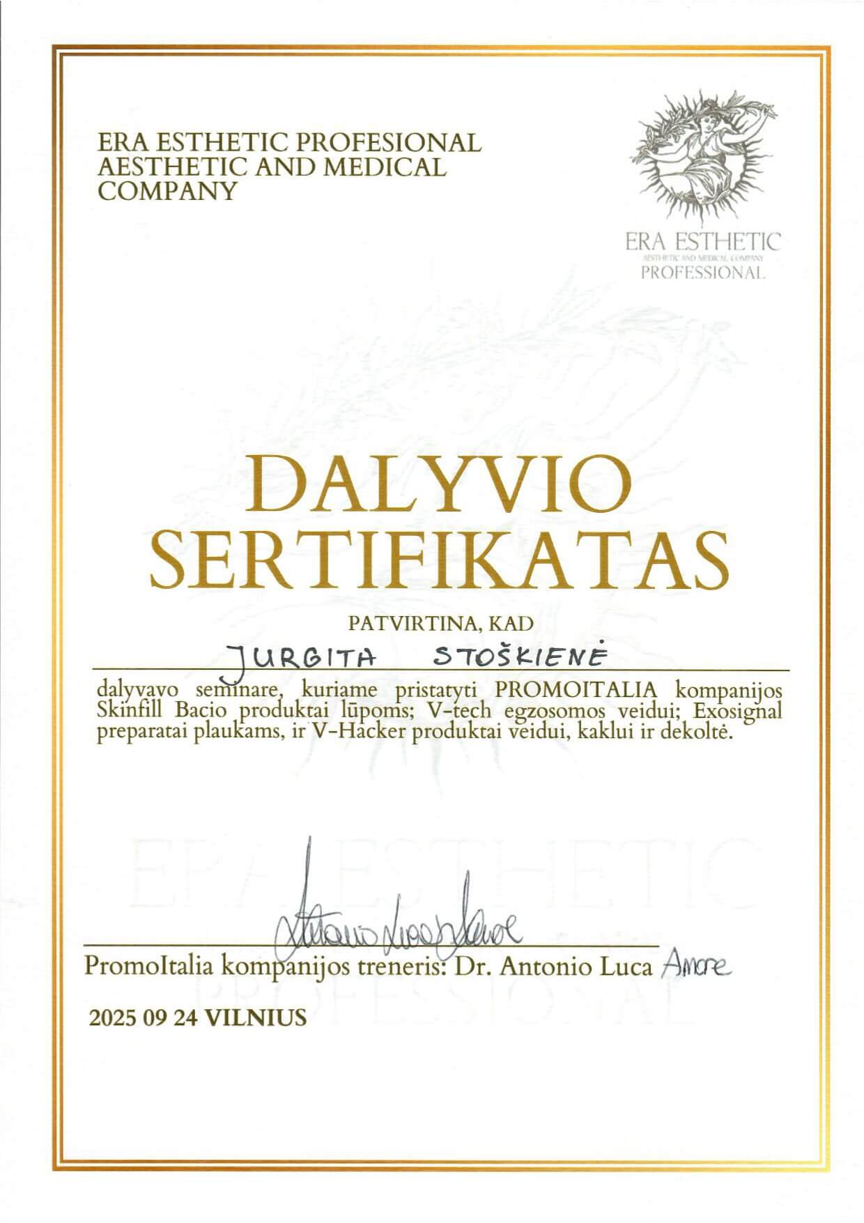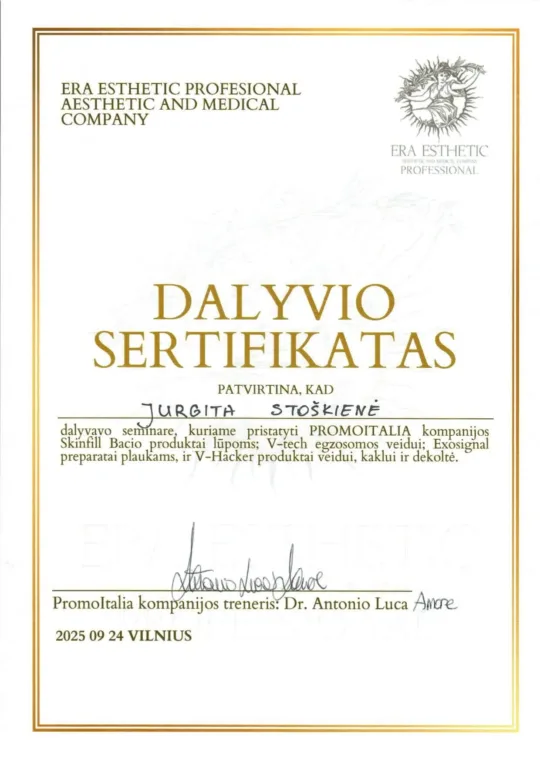 Sertifikuota mezoterapijai Prancūzijos mezoterapijos draugijos.
