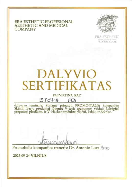 Kauno kolegijoje, ,,Medicinos ir Socialinių studijų centras’’, įgijo bendrosios praktikos - kosmetologės licenciją.
